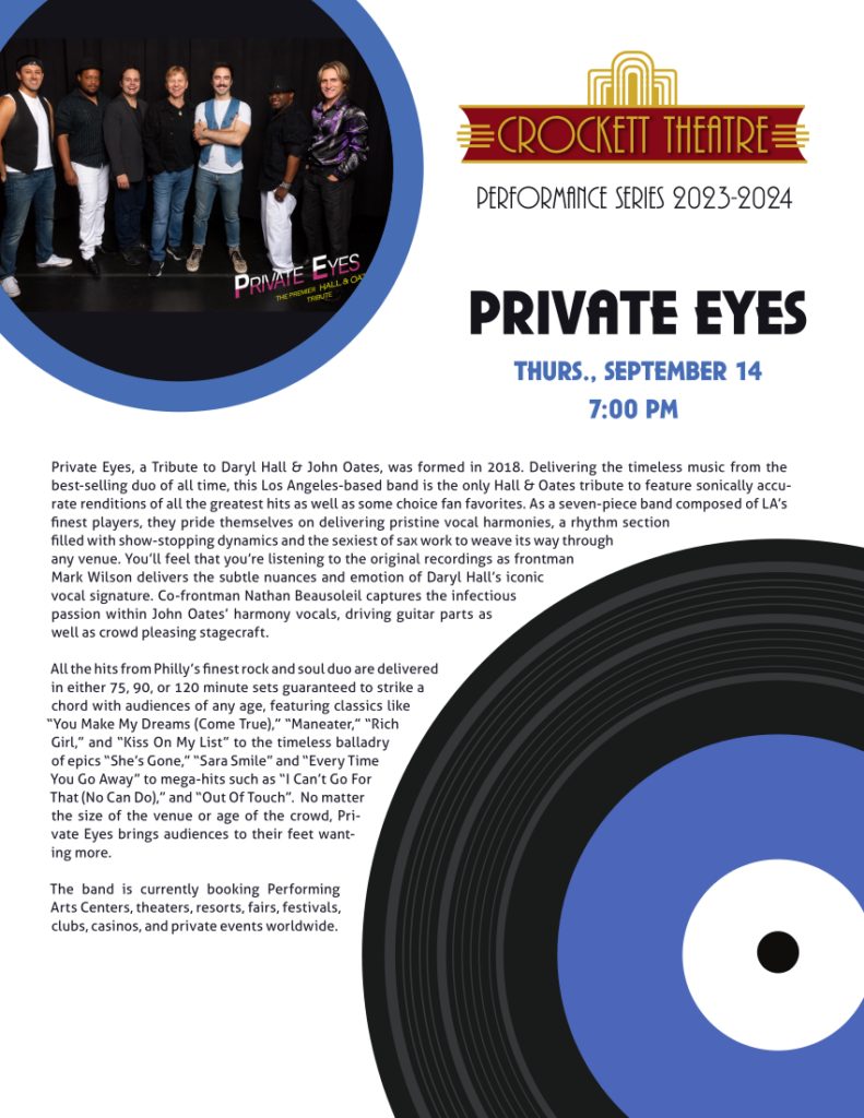 Private Eyes, a tribute to Daryl Hall & John Oates, was formed in 2018. Delivering the timeless music from the best-selling duo of all time, this Los Angeles-based band is the only Hall & Oates tribute to feature sonically accurate renditions of all the greatest hits as well as some...